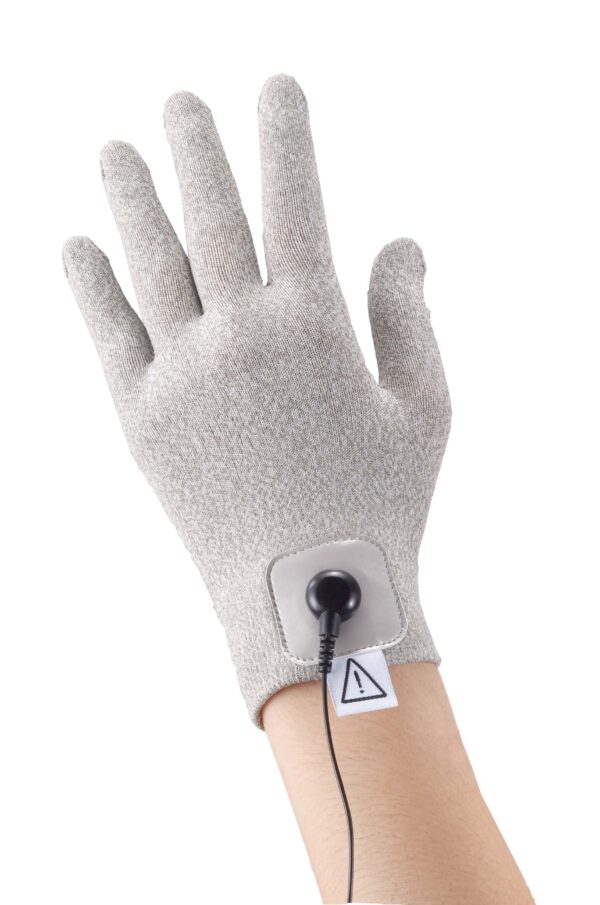 Die Handschuh-Textilelektrode ist eine aus leitfähigem Material gewebte Elektrode. Sie dient der Applikation des Behandlungsstroms eines TENS-Gerätes über die gesamte Hand. Die hervorragende Qualität der Handschuh-Textilelektrode sichert den Erfolg der Schmerztherapie, da die Handschuh-Elektrode sich eng an die Hand anschmiegt und dadurch für einen guten Behandlungserfolg jeder einzelnen Behandlung sorgt. Der Elektrodenhandschuh wird zusammen mit einem Päckchen selbstklebender Elektroden 50 mm x 100 mm geliefert. Diese ableitende Elektrode wird am Unterarm angebracht und schließt den Stromkreis. Probieren Sie die Wirkung des Textilelektrodenhandschuhs aus, Sie werden überzeugt sein.